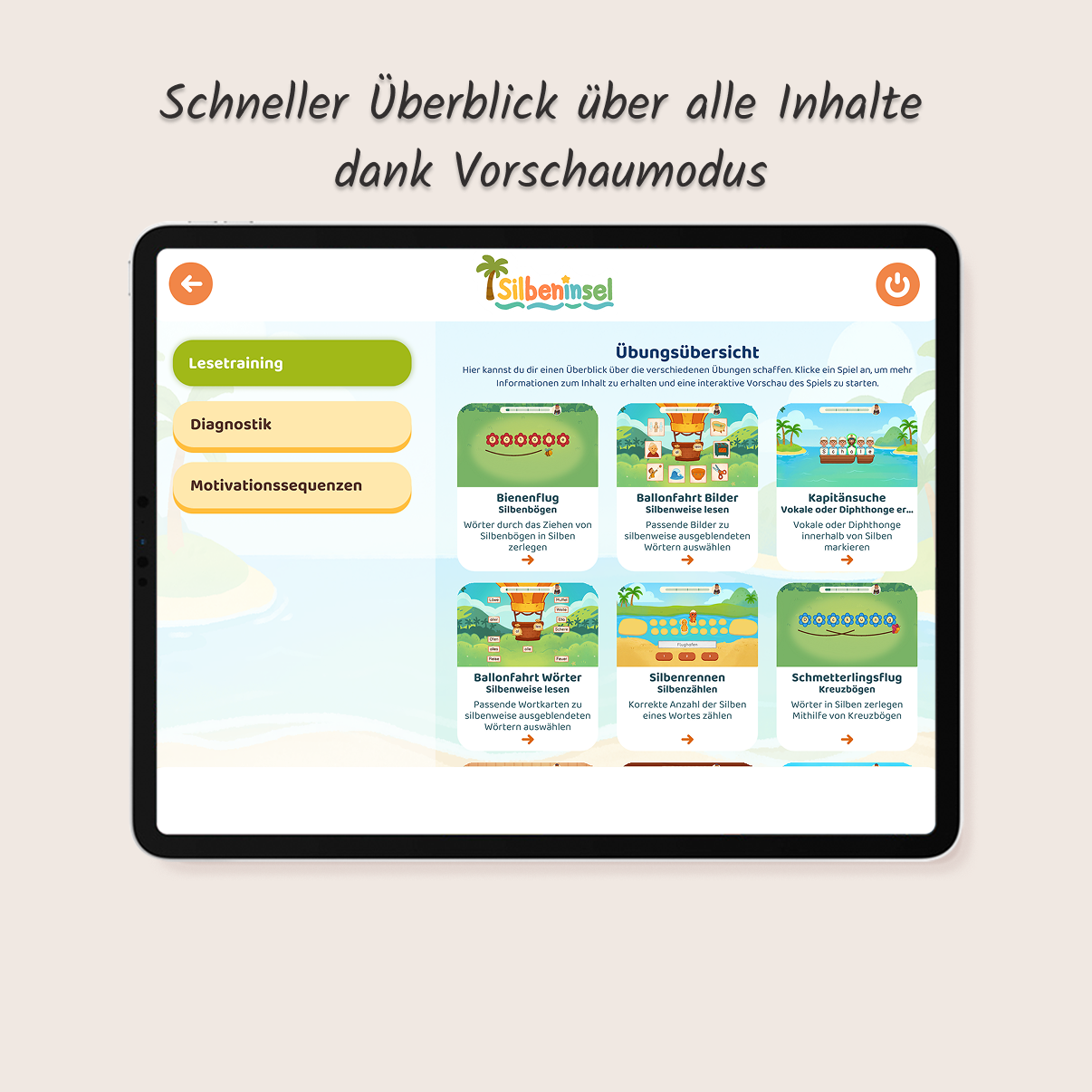 - Alles im Blick: Nutze den Vorschaumodus, um alle Übungen und Förderbereiche gezielt vorab einzusehen.